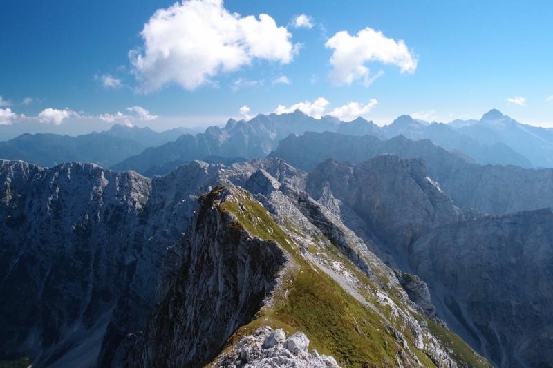 Vpavo vzadu Triglav - pohľad pri zostupe z Mangartu